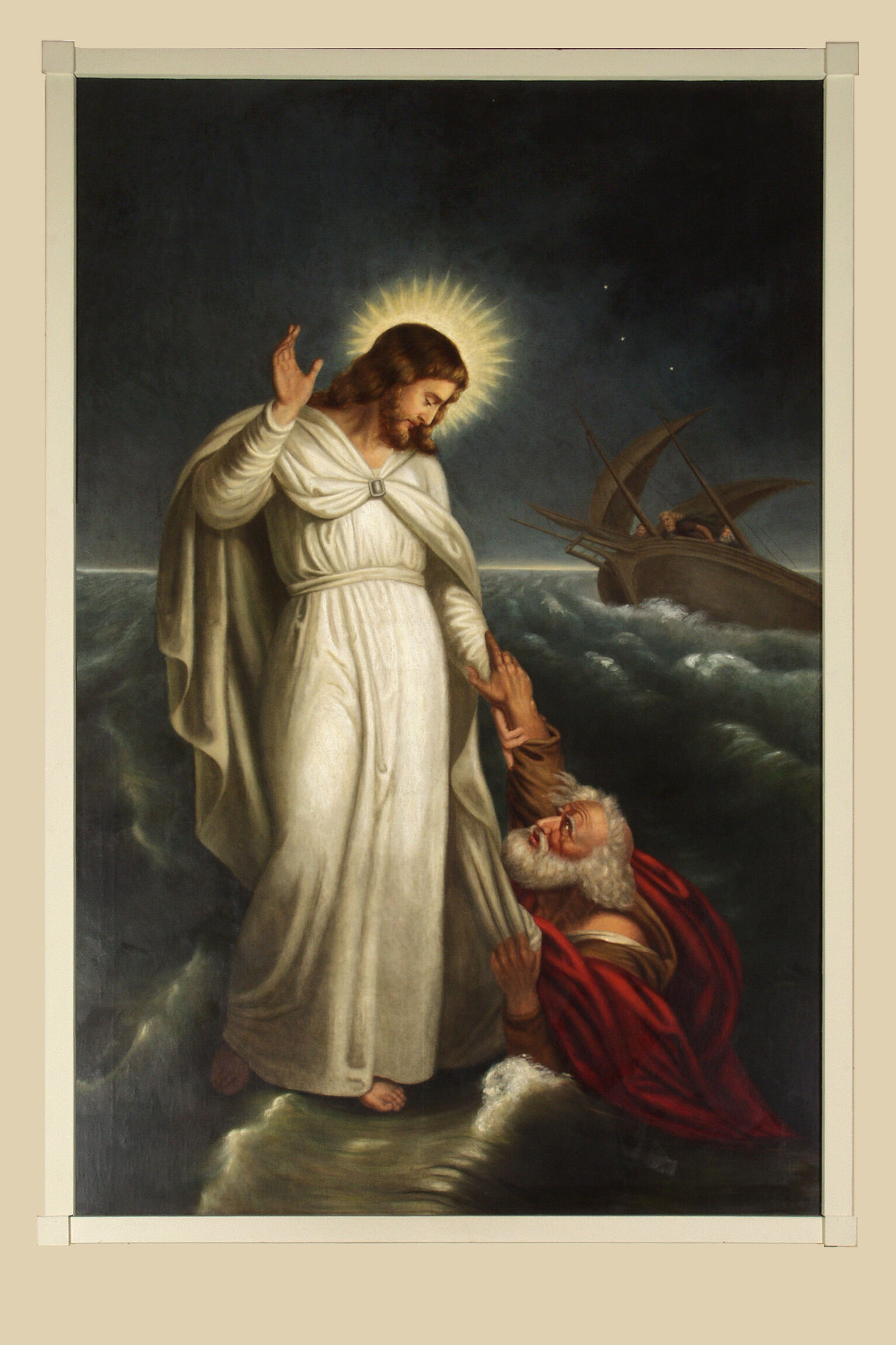 Das Bild wird beherrscht von der großen hellen Gestalt Jesu, der auf dem Wasser steht. Ein heller Strahlenkranz umgibt sein Haupt und er wendet sich Petrus zu, der im Wasser zu versinken droht, und der voller Angst mit der einen Hand das Gewand Jesu und mit der anderen die Hand Jesu ergreift. Im Hintergrund wird das Schiff, in dem die übrigen Jünger sind, von den Wellen mächtig hin und her gerissen. Am Himmel sind einige Sterne zu sehen. Es ist wohl die Zeit zwischen der Nacht und dem anbrechenden Morgen. Am Horizont zieht ein schmaler Lichtstreifen auf, die Nacht wird weichen, der Morgen macht sich schon bemerkbar.